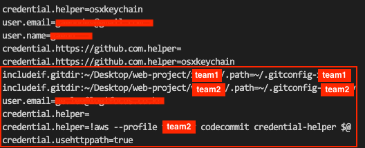 .gitconfig 와 .gitconfig-team1 그리고 .gitconfig-team2 파일을 각각 작성해야한다.