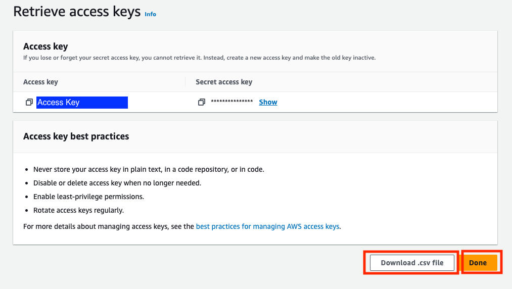 5. 발급된 access key 메모 또는 Download .csv file 선택 후 완료