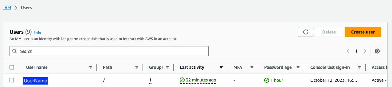 2. access key(액세스 키) 발급을 할 User name 을 클릭해서 해당 유저 정보창 접속