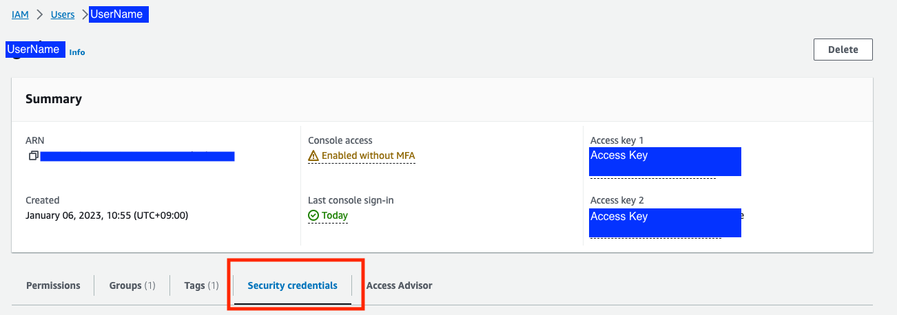 유저 정보창의 Security credentials 탭을 선택후