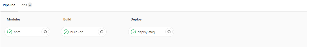 variables: CI: "false" stages: - modules - build - deploy npm: stage: modules cache: paths: - node_modules script: - npm ci --legacy-peer-deps build-job: stage: build cache: paths: - build script: - npm run build:stag only: - main tags: - staging deploy-stag: stage: deploy cache: paths: - build script: - sudo rm -rf /home/project/app - sudo cp -r build /home/project/app1) 최상위 depth에 작성된 npm, build, deploy를 jobs 라고 부른다. (하나의 작업 단위)