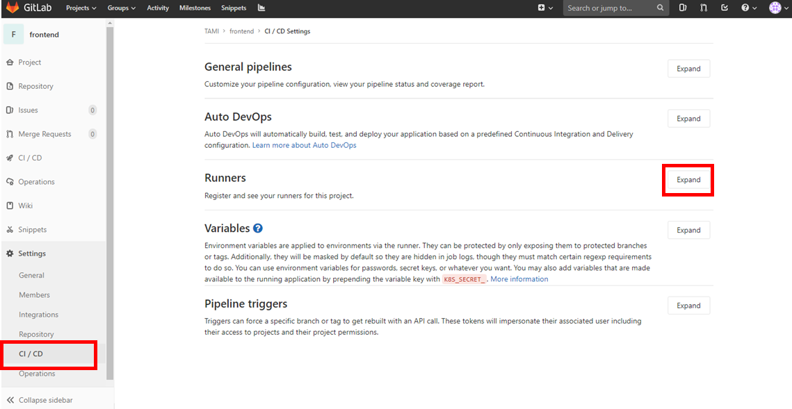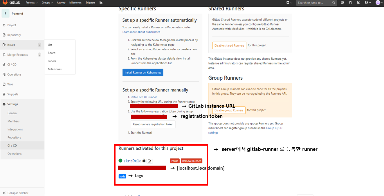- 연결할 GitLab Repository의 Setting > CI/CD > Runner (expand) 에 있는 token을 입력