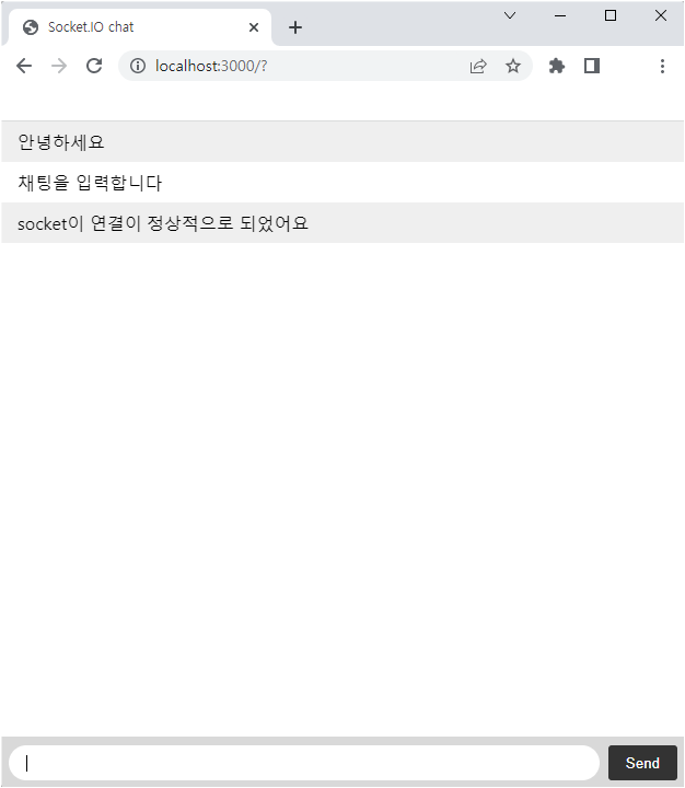 <!DOCTYPE html> <html> <head> <title>Socket.IO chat</title> <style> body { margin: 0; padding-bottom: 3rem; font-family: -apple-system, BlinkMacSystemFont, 'Segoe UI', Roboto, Helvetica, Arial, sans-serif; } #form { background: rgba(0, 0, 0, 0.15); padding: 0.25rem; position: fixed; bottom: 0; left: 0; right: 0; display: flex; height: 3rem; box-sizing: border-box; backdrop-filter: blur(10px); } #input { border: none; padding: 0 1rem; flex-grow: 1; border-radius: 2rem; margin: 0.25rem; } #input:focus { outline: none; } #form > button { background: #333; border: none; padding: 0 1rem; margin: 0.25rem; border-radius: 3px; outline: none; color: #fff; } #messages { list-style-type: none; margin: 0; padding: 0; } #messages > li { padding: 0.5rem 1rem; } #messages > li:nth-child(odd) { background: #efefef; } </style> </head> <body> <ul id="messages"></ul> <form id="form" action=""><input id="input" autocomplete="off" /><button>Send</button></form> <script src="/socket.io/socket.io.js"></script> <script> const socket = io(); // script를 body안에 두어야 element들이 null이 안뜬다 const messages = document.getElementById('messages'); const form = document.getElementById('form'); const input = document.getElementById('input'); form.addEventListener('submit', function (e) { e.preventDefault(); if (input.value) { // 작성된 채팅 내용을 'chat message'로 보냄 socket.emit('chat message', input.value); input.value = ''; // 입력칸 초기화 } }); // 받은 채팅 내용을 화면에 뿌려줌 socket.on('chat message', function (msg) { const item = document.createElement('li'); item.textContent = msg; messages.appendChild(item); window.scrollTo(0, document.body.scrollHeight); }); </script> </body> </html>위와 같이 파일을 작성한 후 실행합니다