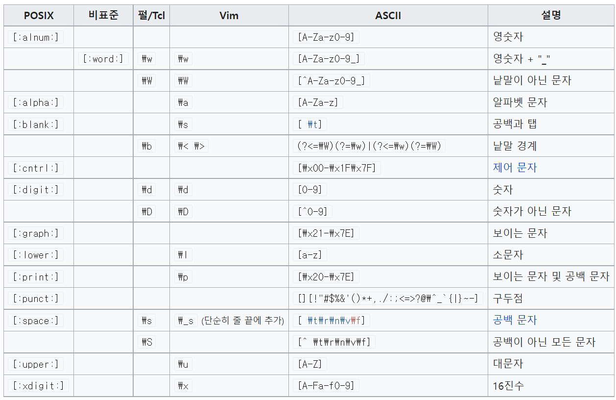 위키 백과의 정규표현식에 보면 아래와 같이 클래스를 정의하고 있다.